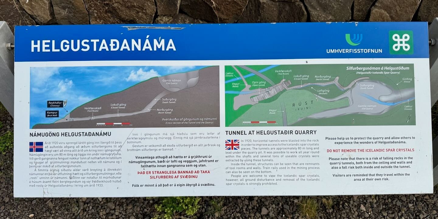 Más allá del interés de la mina, si aciertas a visitarla en un día claro también podrás disfrutar de unas espléndidas vistas sobre el Reyðarfjörður, con la agreste península de Vattarnes cubriendo el horizonte hacia el sur. Por supuesto, Helgustaðanáma no es una de las visitas imprescindibles de Islandia. Ni siquiera de los Fiordos del Este. Pero si estás por la zona y te sobran unos minutos, puede ser una parada interesante, que te permitirá conocer un poco mejor la extraña historia de la Tierra de Hielo.