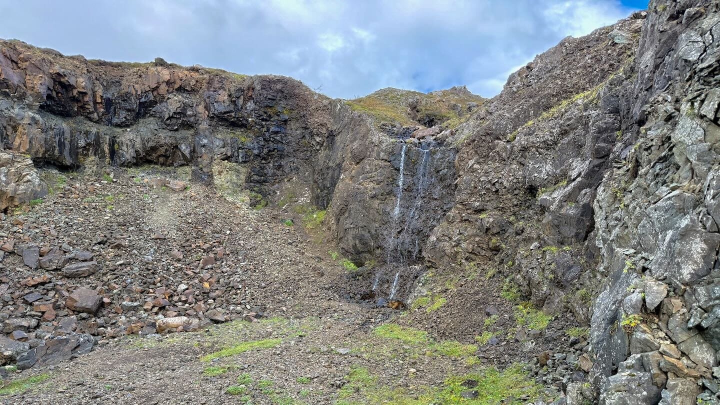 La mina se divide en dos explotaciones. La más antigua es la superior, que parece tener sus orígenes en una expedición organizada por el rey danés Federico III en 1668. Aunque la explotación a cielo abierto, que podemos ver hoy, parece haber estado operativa entre 1855 y 1872. La mina es poco más que un socavón en el terreno en el que, al menos el día de mi visita, se precipitaba una diminuta cascada.