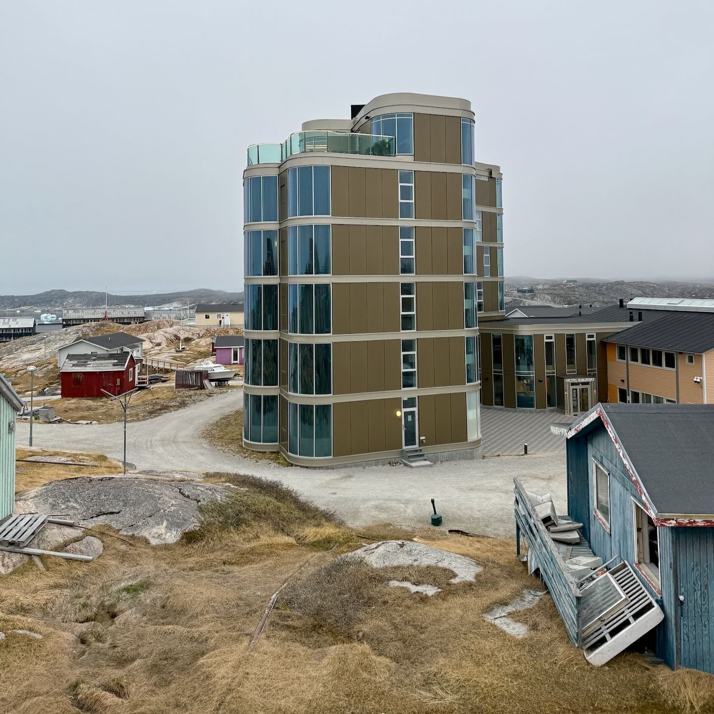 Para dormir, había elegido el Hotel Ilulissat, de la cadena Best Western. Inicialmente me había decantado por el Arctic, propiedad de World of Greenland. Con mucho mejor aspecto y unas vistas, en principio, mucho más interesantes. Pero el factor determinante acabó siendo la distancia hasta el principal mirador sobre el Ilulissat Kangerlua. Desde el Best Western había 2.700 metros. Una distancia razonable para recorrer caminando, que se convertía en más de 4 kilómetros desde el Arctic. Al final, creo que fue un acierto. Estéticamente, el exterior del hotel era un horror, totalmente fuera de lugar. Pero el interior era moderno y confortable, las vistas desde la habitación una maravilla y el desayuno, también con un espléndido panorama, bastante completo. Además, estaba en pleno centro de la pequeña ciudad, a un paso de casi todo.