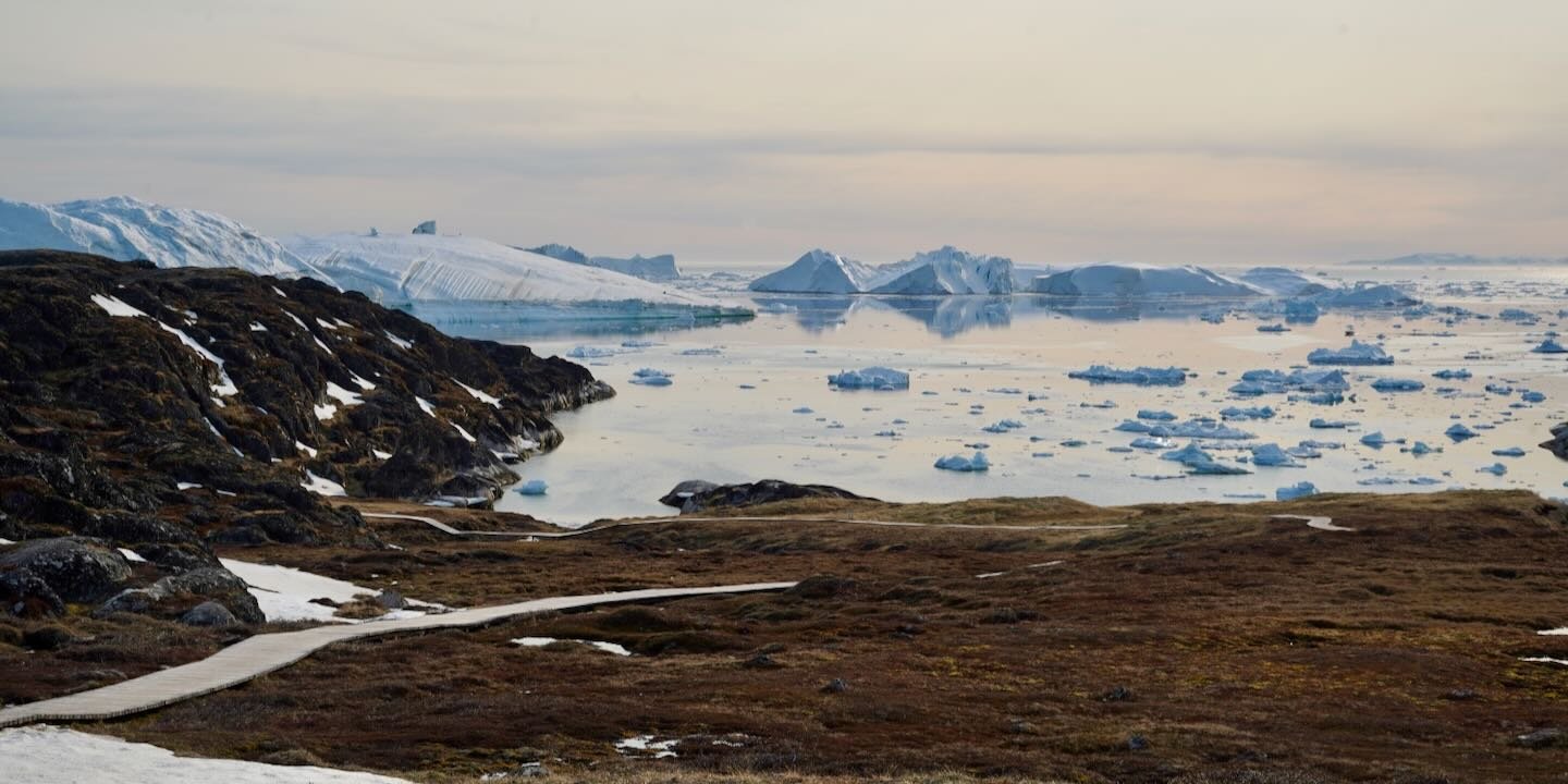 El Ilulissat Kangerlua también es accesible desde tierra. Una pequeña red de sendas sale del Icefjord Centre, haciendo posible acercarse a la orilla septentrional del fiordo. La azul tiene un tramo perfectamente acondicionado con tablones, que permite llegar cómodamente a las inmediaciones del mirador principal sobre el Kangia. Desde allí, es posible completar un círculo de 7 kilómetros, para volver a Ilulissat después de haber recorrido una parte del fiordo, o atajar por la senda roja, que acorta de vuelta al Icefjord Centre. Este camino fue el que atravesé durante la primera de mis dos excursiones consecutivas hasta el Kangia, en mi primer día completo en la ciudad. En la segunda, coincidiendo con el atardecer, regresé por la plataforma de madera. Al igual que en la tercera, durante mi quinta tarde en Ilulissat.