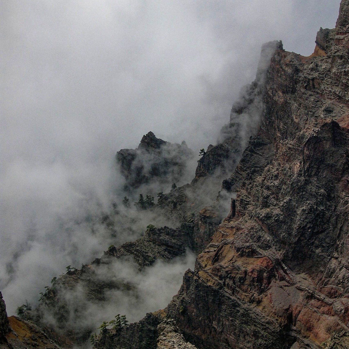 El motivo de tal proliferación de telescopios es el extraordinario clima de la isla. Los vientos alisios, que soplan desde el nordeste, suelen crear una capa de nubes, entre los 1.000 y 2.000 metros de altitud, con el doble efecto de dejar un cielo extraordinariamente limpio por encima y ocultar las luces artificiales por debajo. Al menos, eso es lo habitual. Acertamos a visitar La Palma durante unos días extraordinariamente nubosos. Preciosos para contemplar paisajes etéreos, surgiendo entre la bruma. Pero no tanto para visitar los observatorios, que apenas pudimos ver a lo lejos, parcialmente ocultos entre las nubes. En cualquier caso, entonces aún no existía el Centro de Visitantes del Observatorio Astronómico del Roque de los Muchachos. Creo que habría sido imposible hacer mucho más.