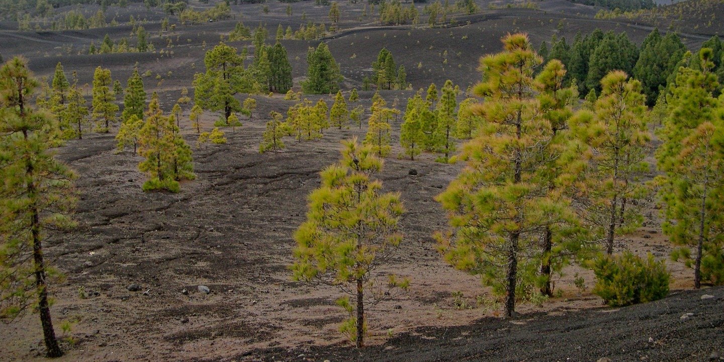 Los conos que hay al norte de Fuencaliente y la carretera LP-2 forman parte del Parque Natural de Cumbre Vieja. También fue creado en 1987, aunque ocupa una extensión bastante mayor, que roza las 7.500 hectáreas. Más allá de la sucesión de volcanes, nos llamó la atención la vegetación. Sobre todo, los pinos canarios. Una especie que ha logrado adaptarse al vulcanismo, desarrollando la capacidad de rebrotar desde el xilema tras sufrir daños traumáticos. Una característica única entre las pináceas del Viejo Mundo.