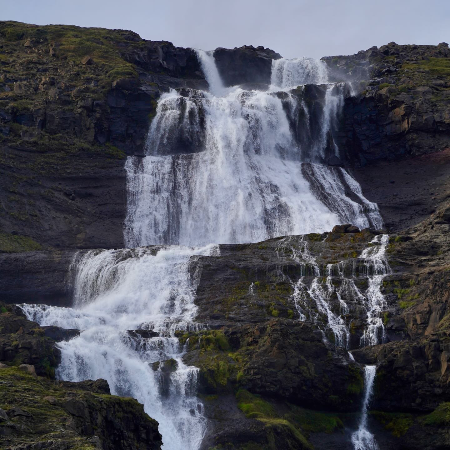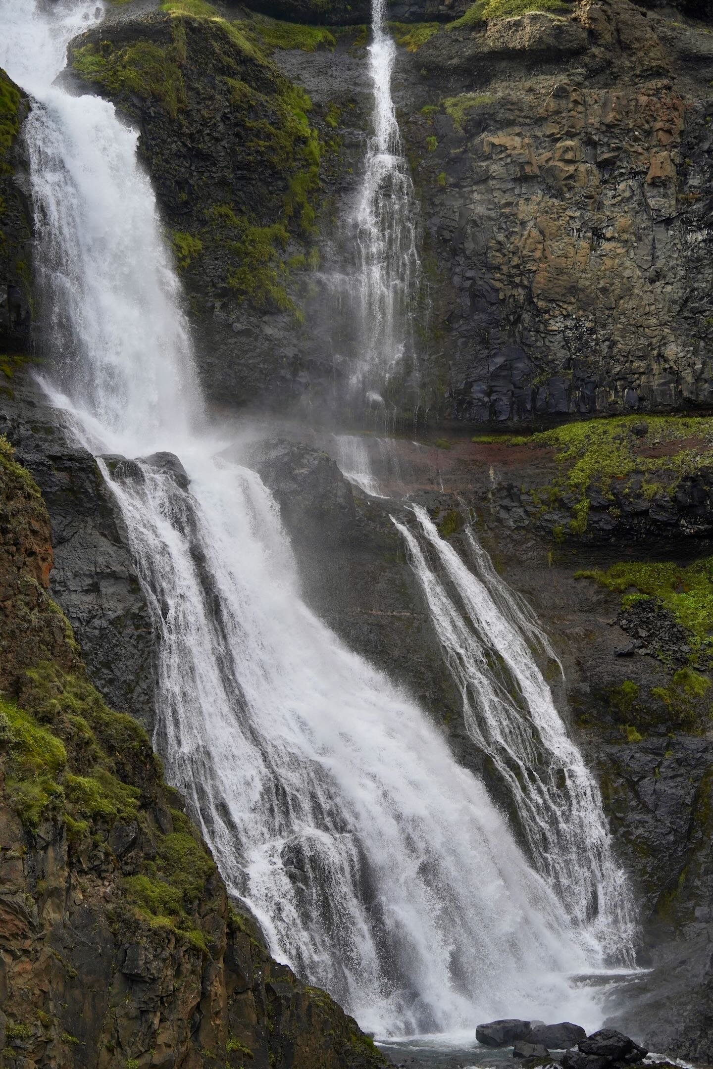 Debido a su cercanía a las Tierras Altas nororientales y al caudal, no excesivamente abultado, del Ysta-Rjúkandi, Rjúkandafoss también es un magnífico ejemplo de algo que he expuesto varias veces en este blog: durante su largo invierno, las cascadas de Islandia son lugares bastante erráticos. Lo mismo pueden convertirse en un espacio mágico, donde el agua y el hielo crean formas imposibles, que en otro bastante anodino, con el salto de agua virtualmente indistinguible de su entorno. Conocí Rjúkandafoss en estas circunstancias, convertida en un bloque de hielo prácticamente mimetizado con el resto de la ladera. En mi segunda visita, aún quedaba algún rastro de agua, pero nada realmente interesante. Motivo por el que, tras un recorrido no demasiado satisfactorio por el cañón de Stuðlagil, decidí hacer un breve rodeo durante mi regreso a Möðrudalur y dar una tercera oportunidad a la cascada.