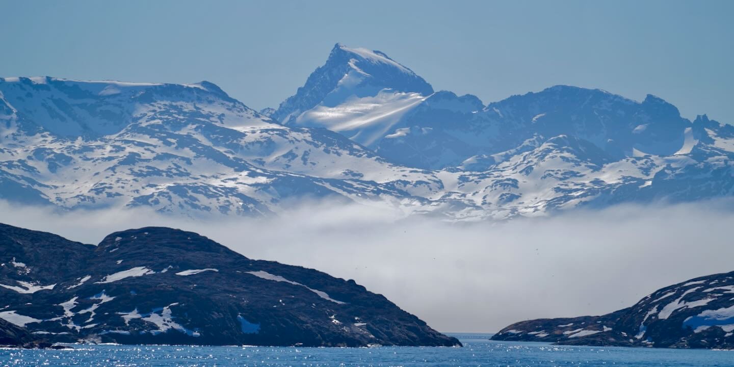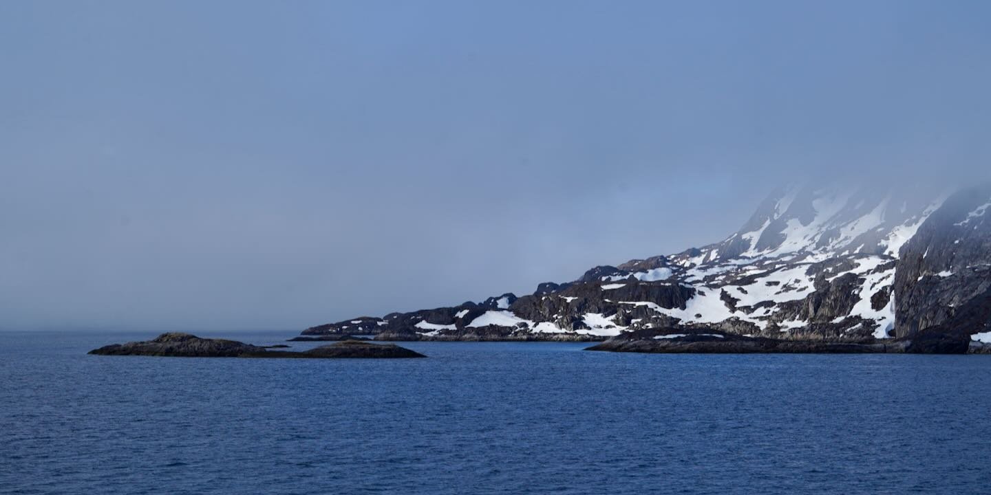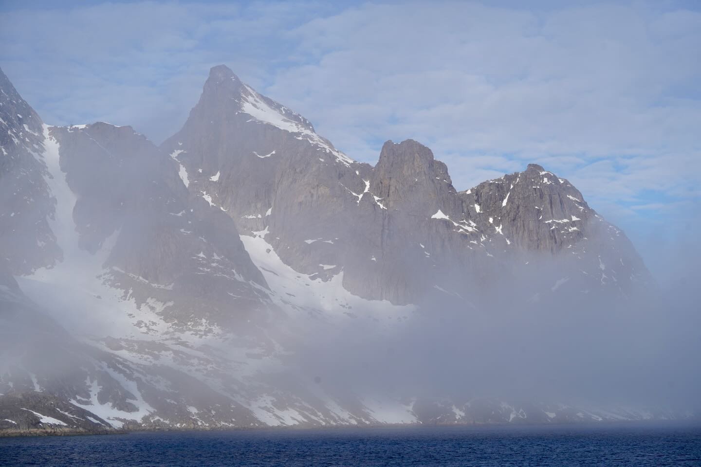 Durante un breve lapso de tiempo, mientras navegábamos hacia el oeste buscando nuevamente mar abierto, pudimos entrever el impresionante paisaje que nos rodeaba. Agrestes laderas, en las que la nieve y la roca se entremezclaban, elevándose hacia un cielo donde se abrían algunos claros, de un intenso color azul. La niebla parecía estar muy pegada al suelo. Por un momento, pensé que la situación no tardaría en mejorar. Falsas esperanzas. Apenas tardamos unos minutos en adentrarnos en un nuevo banco de niebla, aún más denso que el anterior. El claro había sido poco más que un espejismo. O un maleficio de los dioses inuit, para mostrarnos fugazmente aquello que finalmente nos sería vedado contemplar.